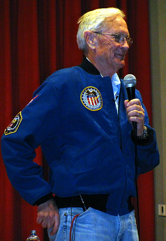 Bola extra: una foto de Charlie Duke, astronauta del Apolo 16, tomada durante la accidentada conferencia que dio el pasado día 28 de marzo. Accidentada porque toda la zona de los pabellones feriales de la Casa de Campo se quedó sin electricidad, y la organización hizo encaje de bolillos para encontrar otro lugar apropiado, trasladar todo el equipo de vídeo, al público y —naturalmente— al conferenciante. En ningún momento perdió nadie la sonrisa, pese al tremendo retraso.