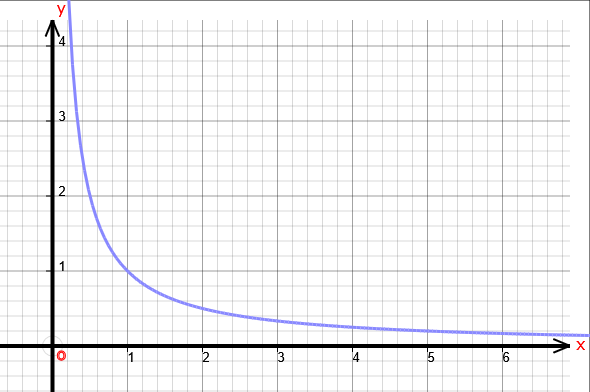 Gráfico de la función f(x)=1/x empezando en x=0. Vale infinito en cero, 1 en 1 y tiende después a cero.