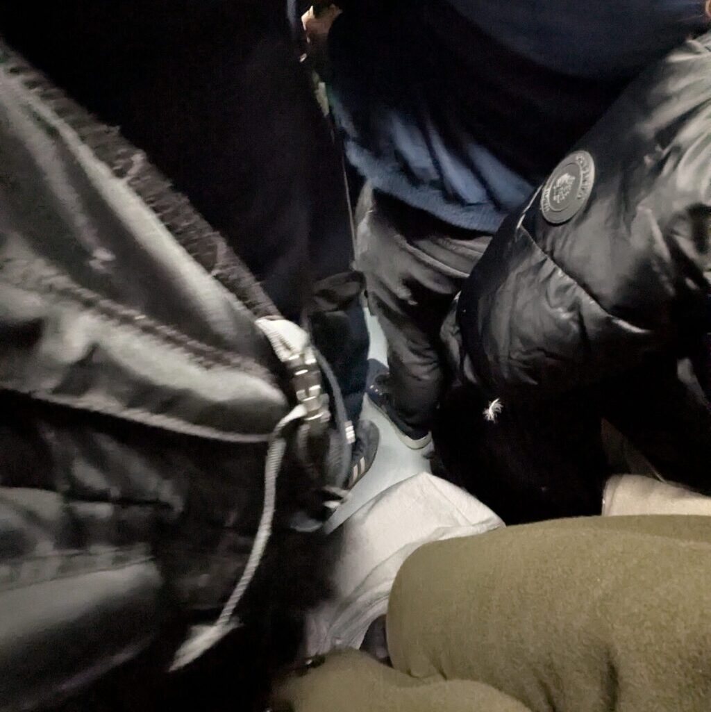 Pasajeros apiñados en un tren de Metro de Madrid. Foto mirando hacia el suelo, del que solo se ve una parte pequeñisima donde no cabe un pie más.